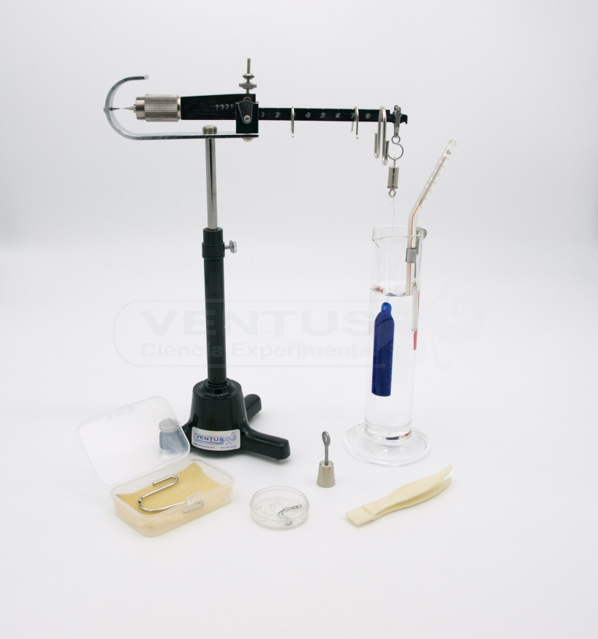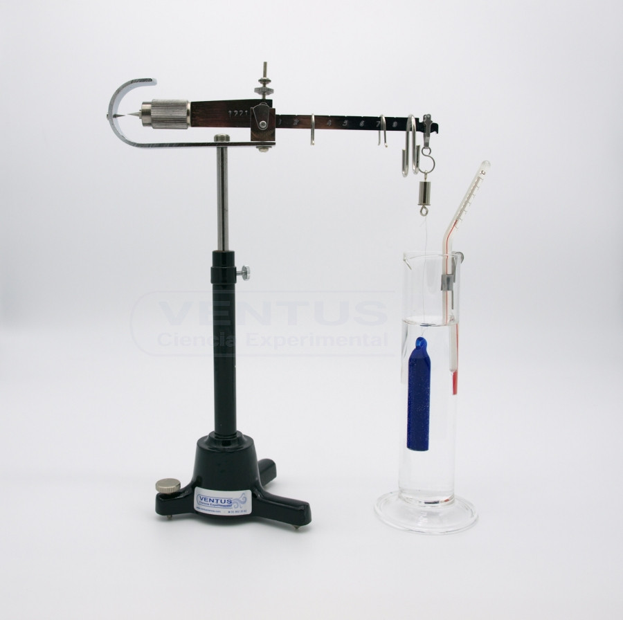 Se suministra con base nivelable y regulable en altura, gancho-balancín para colgar inmersor, inmersor de vidrio calibrado de 5 cm3, pesa de 15 g, juego de pesas de precisión con pinzas (2x 5 g, 2x 0,5 g, 2x 0,05 g, 2x 0,005 g), termómetro y probeta.