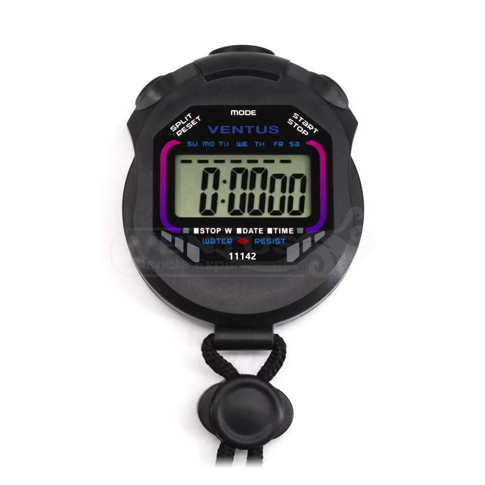 Tiempo transcurrido y tiempo fraccionado. Hora, calendario y alarma. Resolución 1/100, dígitos 8 mm. Con cordón.