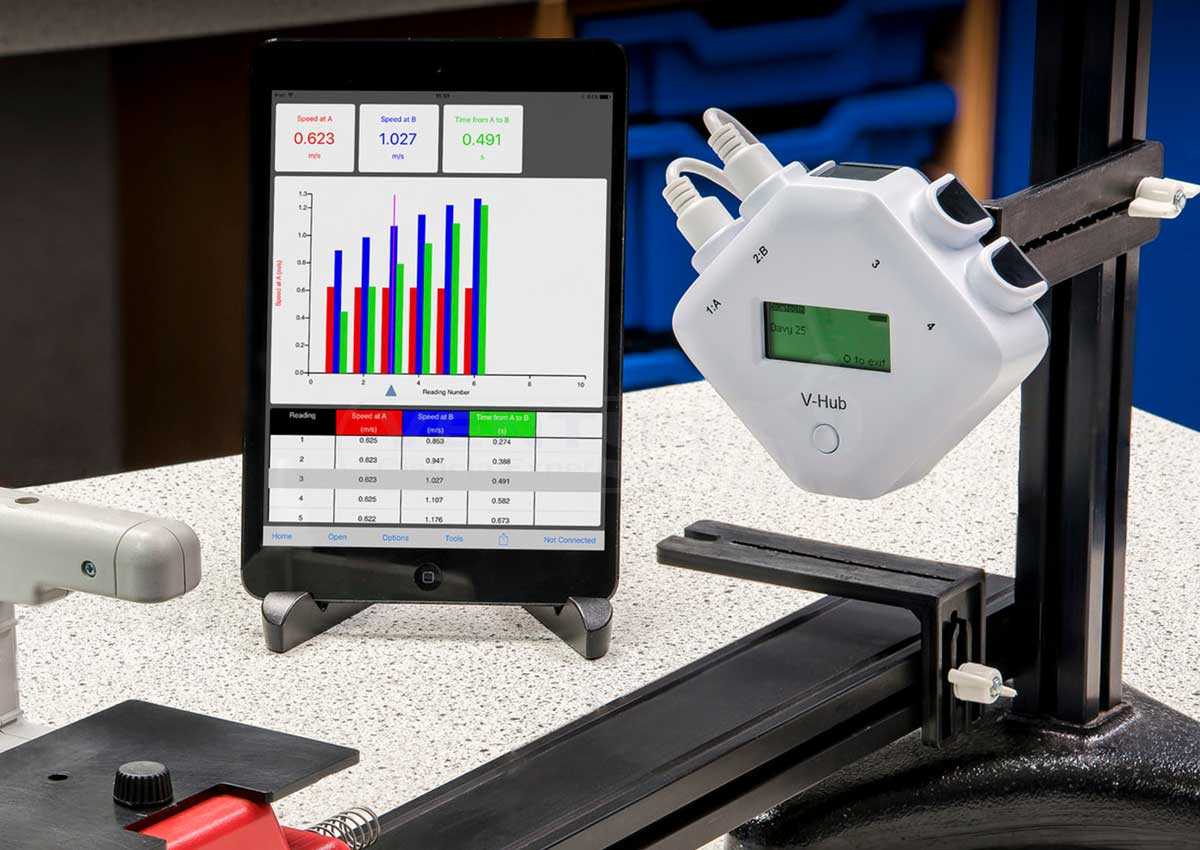 Tiene entradas para la conexión de hasta 4 sensores externos (analógicos y digitales). Identificación y calibración automática de los sensores al ser conectados. Velocidad de muestreo de hasta 50.000 mediciones por segundo (20 µs entre mediciones). Medición de tiempo digital de A a B usando fotopuertas con una precisión de 4 µs.