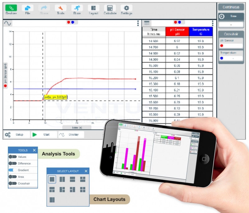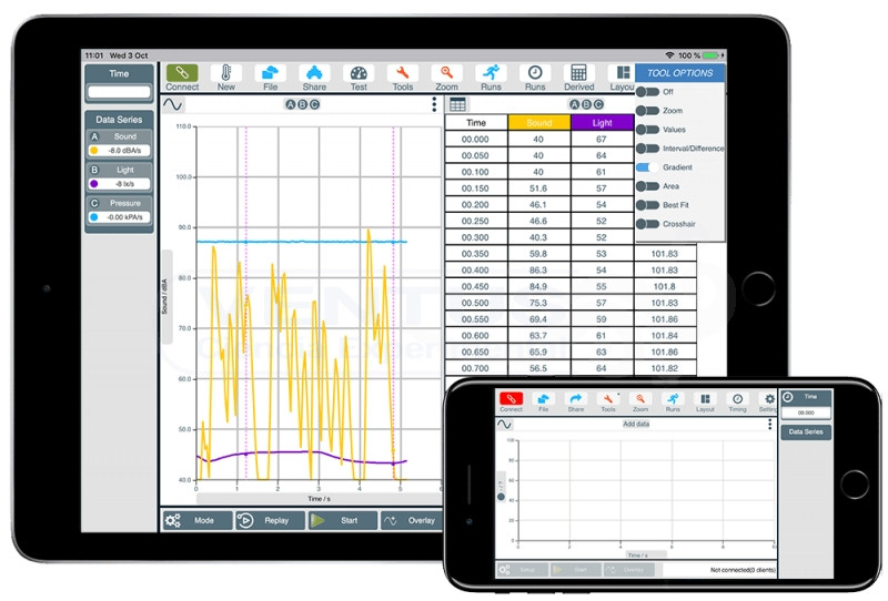 Las medidas se pueden almacenar en memoria y posteriormente ser volcadas al PC. Dispone de un display LCD de 8 líneas en el que se muestran las medidas de los sensores. Tiene entradas para la conexión de hasta 4 sensores externos (analógicos y digitales). Identificación y calibración automática de los sensores al ser conectados. Velocidad de muestreo de hasta 50.000 mediciones por segundo (20 µs entre mediciones). Medición de tiempo digital de A a B usando fotopuertas con una precisión de 4 µs. Conexión a PC mediante puerto USB. Baterías internas de litio recargables que permiten la toma de datos sin conexión a PC durante 14 días sin necesidad de recarga. Memoria interna para almacenar conjuntos de mediciones.