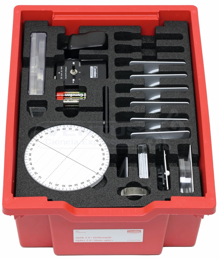 Todos los elementos están almacenados en estuche de plástico con interior extraíble de espuma troquelada y tapa transparente. Manual de experimentos con fichas para alumno y profesor con resultados experimentales.