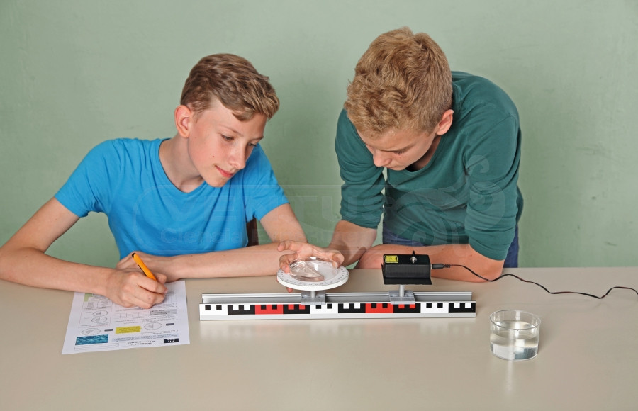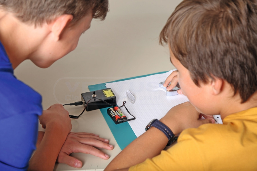Destaca una caja con iluminación dual: LED y láser seleccionables con un interruptor. El láser es Clase I (seguro para usar por el alumno). La iluminación LED es ideal para hacer proyecciones. El diodo láser se usa para presentación de rayos periféricos, seguimiento de trayectorias, interferencia y difracción en redes y estudios de polarización. La caja de luz se alimenta con pilas (incluidas) o con un alimentador a red (incluido).