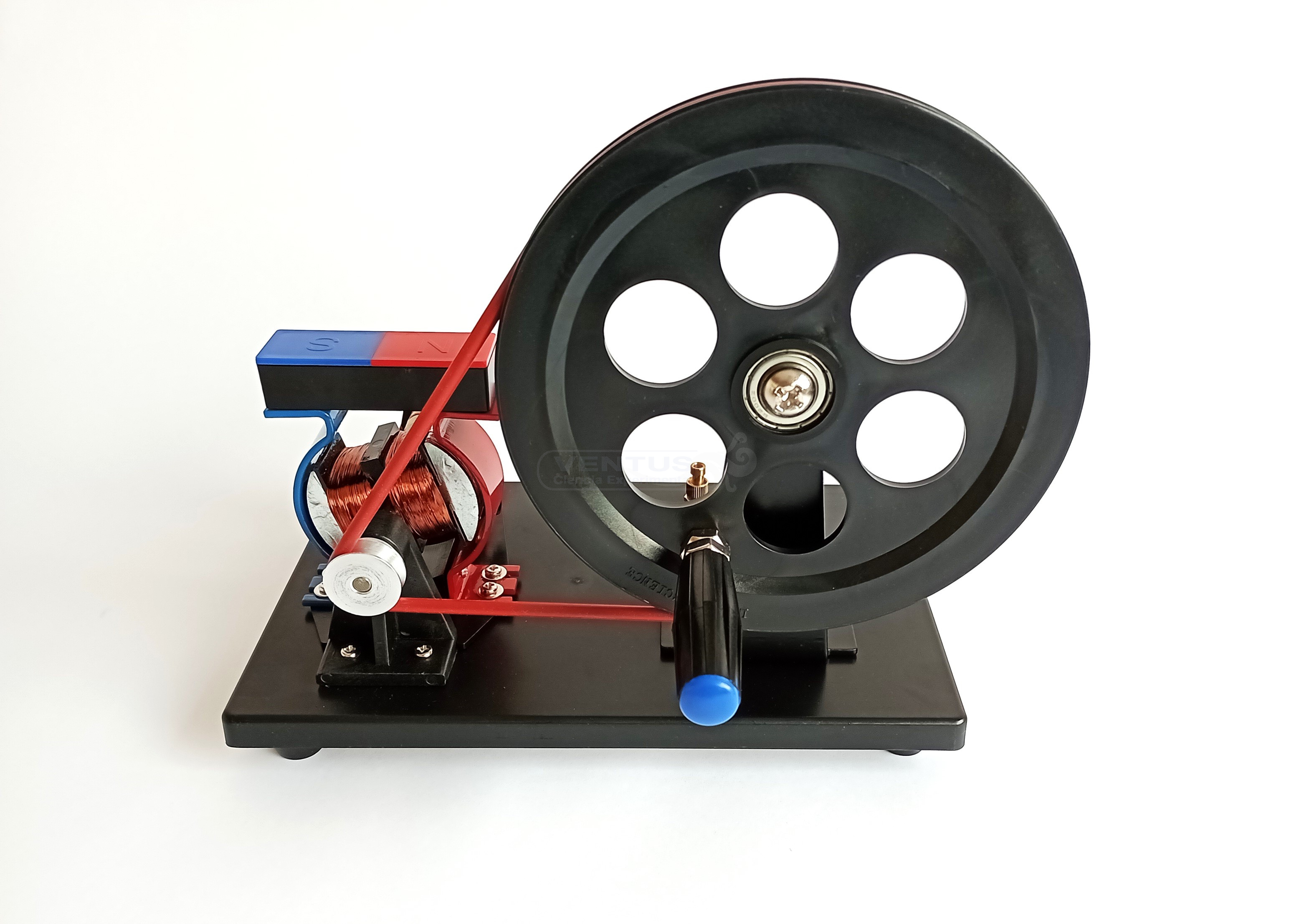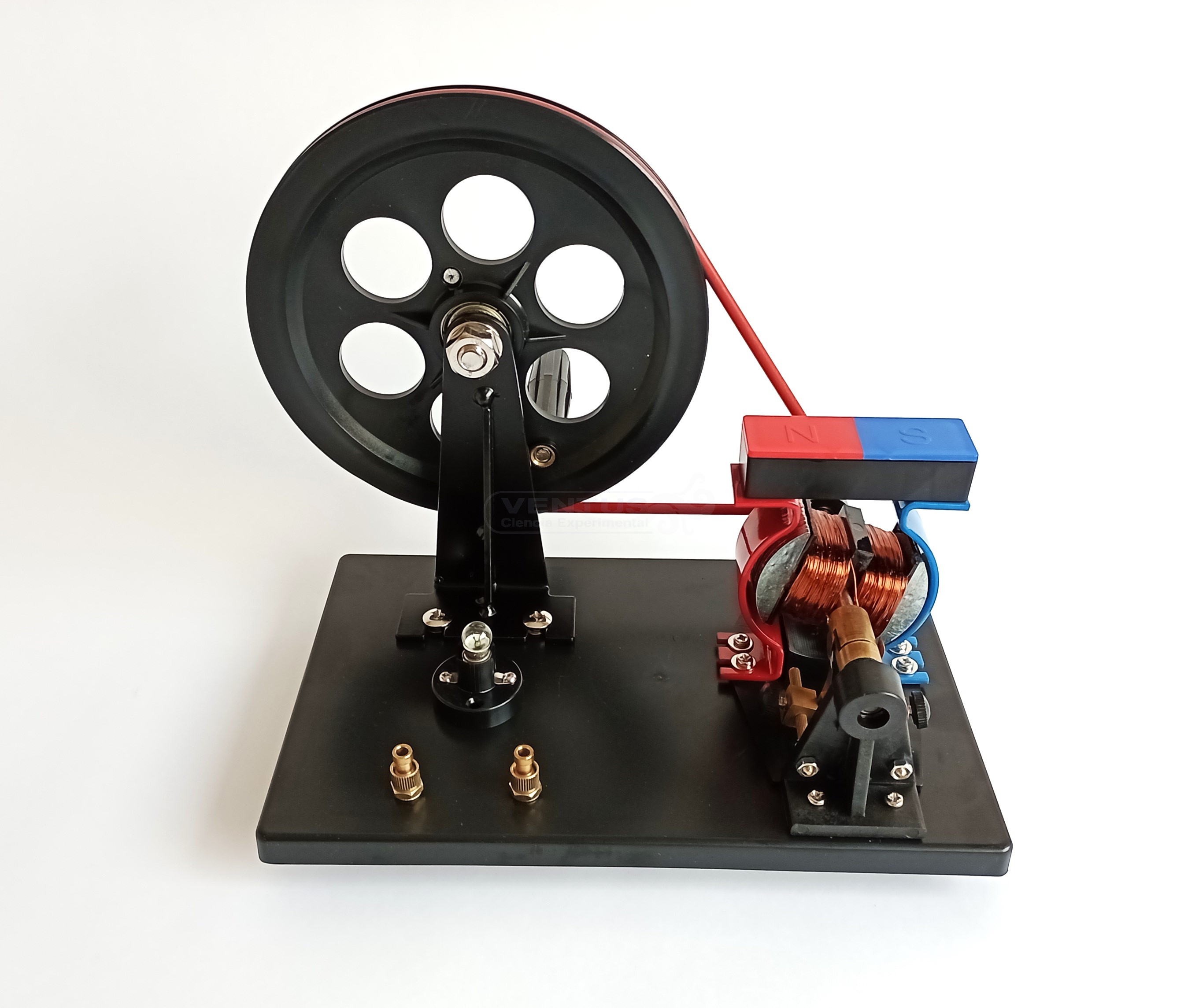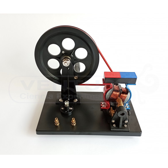 Generador de CC o CA de construcción abierta para ver su funcionamiento. Manivela, polea, bobinado e imán permanente. Lámpara integrada y bornes de conexión. Según la posición de las escobillas en el rotor podremos obtener corriente continua o corriente alterna.