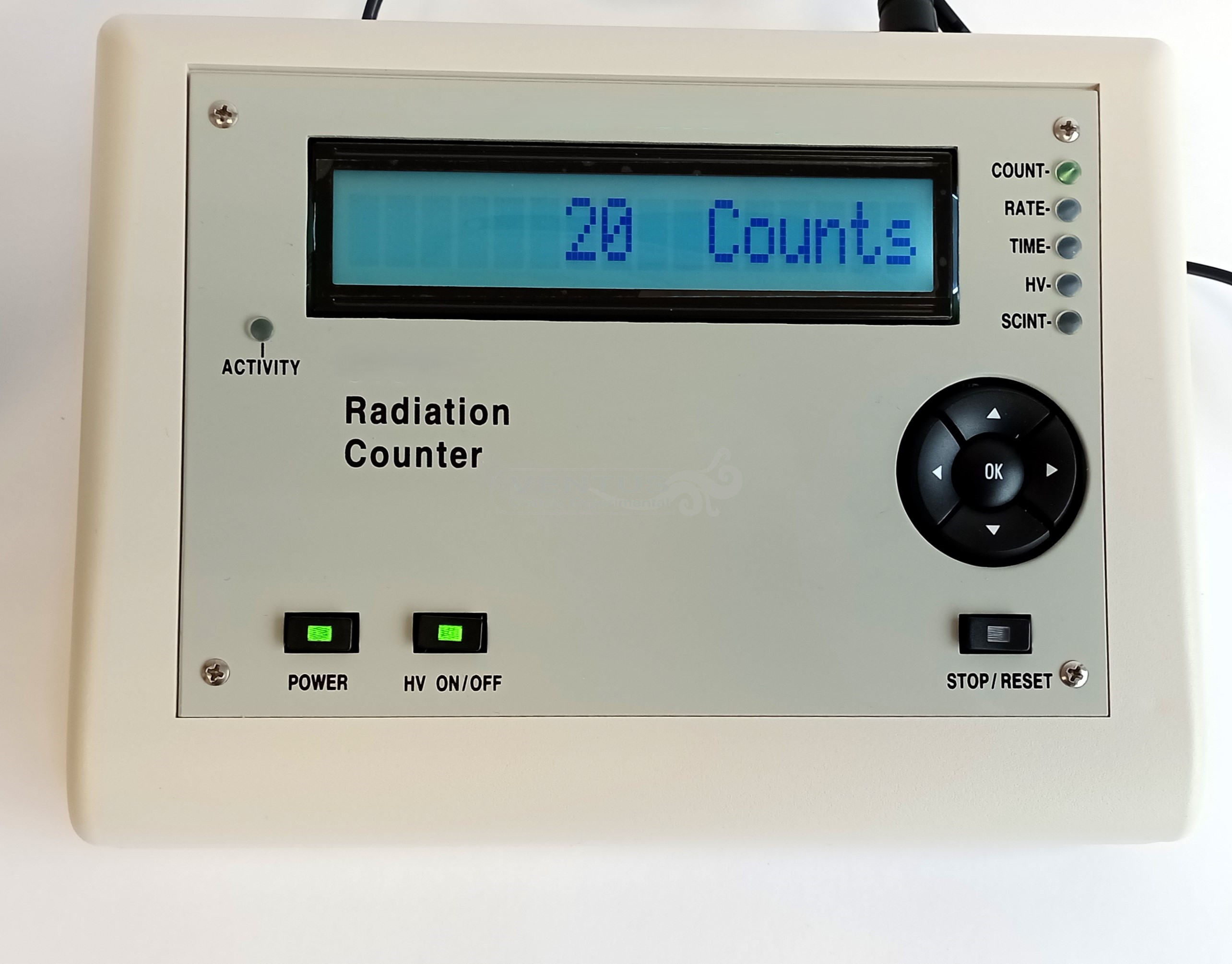 Dispone de un medidor de radiactividad muy versátil con una avanzada tecnología de circuitos de estado sólido. El medidor de radiactividad mide el número total de cuentas en un intervalo de tiempo especificado. El medidor tiene una alimentación de alto voltaje variable incorporada (desde 0 a 1200 V) para alimentar el tubo G-M (Ø35 mm) por conector BNC, con botones para controlar las funciones de tasa de conteo, intervalos de tiempo y voltaje del tubo, así como indicador de actividad mediante led. Display alfanumérico retroiluminado de 16 caracteres LCD.