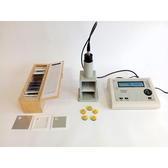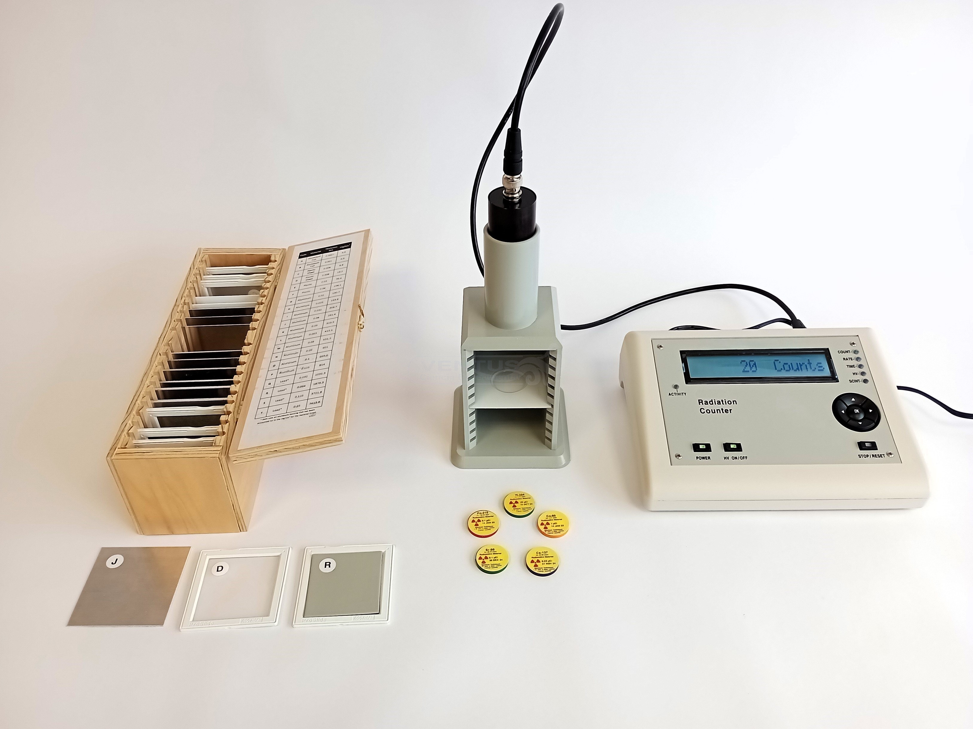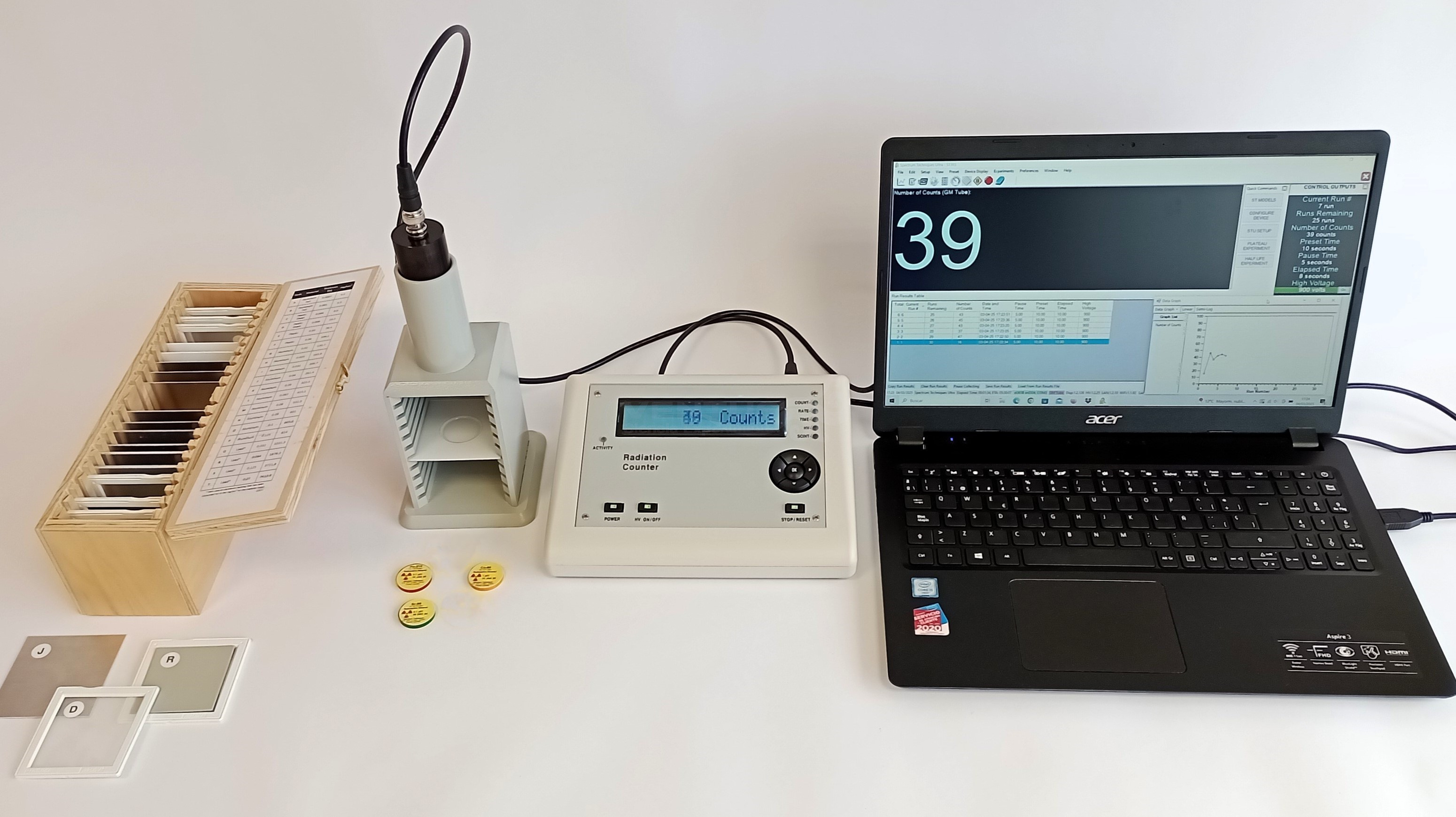 Para estudiar con gran precisión los siguientes aspectos: vidas medias, apantallamiento de la radiación, ley de la inversa del cuadrado, fechado radiactivo, backscattering, estadísticas, etc. El medidor de radiactividad mide el número total de cuentas en un intervalo de tiempo especificado. Los 20 absorbentes se pueden situar en 10 posiciones entre el tubo y la fuente radiactiva para experimentos de absorción. El mediror tiene una alimentación de alto voltaje variable incorporada. Puede ser usado con o sin conexión a ordenador mediante puerto USB. Mediante el software se pueden controlar todas las funciones del contador desde el ordenador.