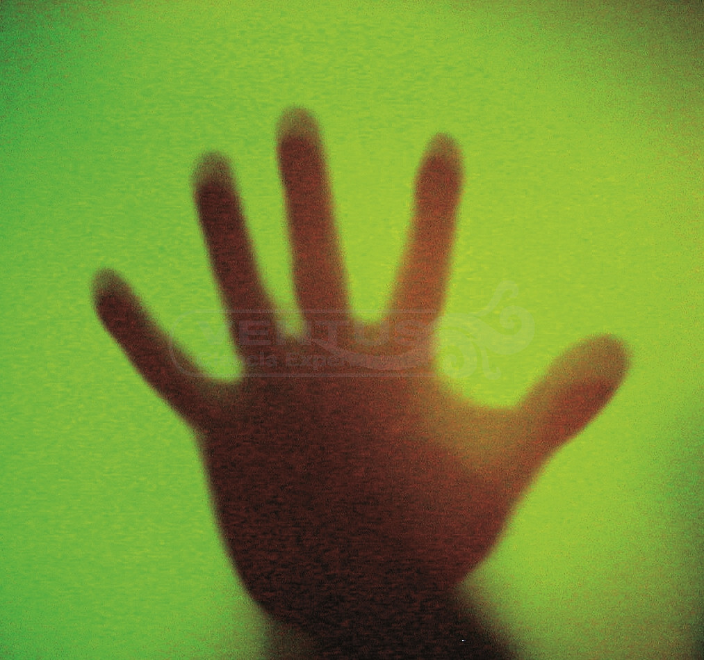 Este material que luce en la oscuridad, absorbe la luz y la emite lentamente durante varios minutos. Si se pone la mano en la lámina y aplicamos una luz, se puede ver la huella dejada (sombra) en dicha lámina cuando se sitúa en la oscuridad. En una sala oscura, el flash de una cámara puede excitar este material.