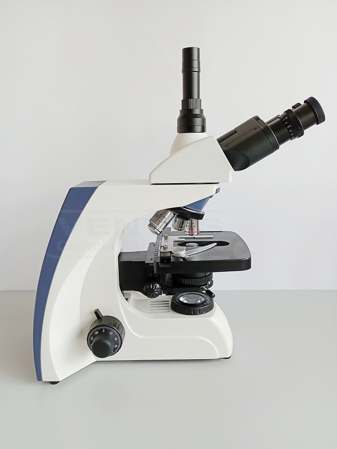 - Microscopio trinocular con 40x hasta 1000x aumentos, con óptica Plano-acromática con corrección a infinito.