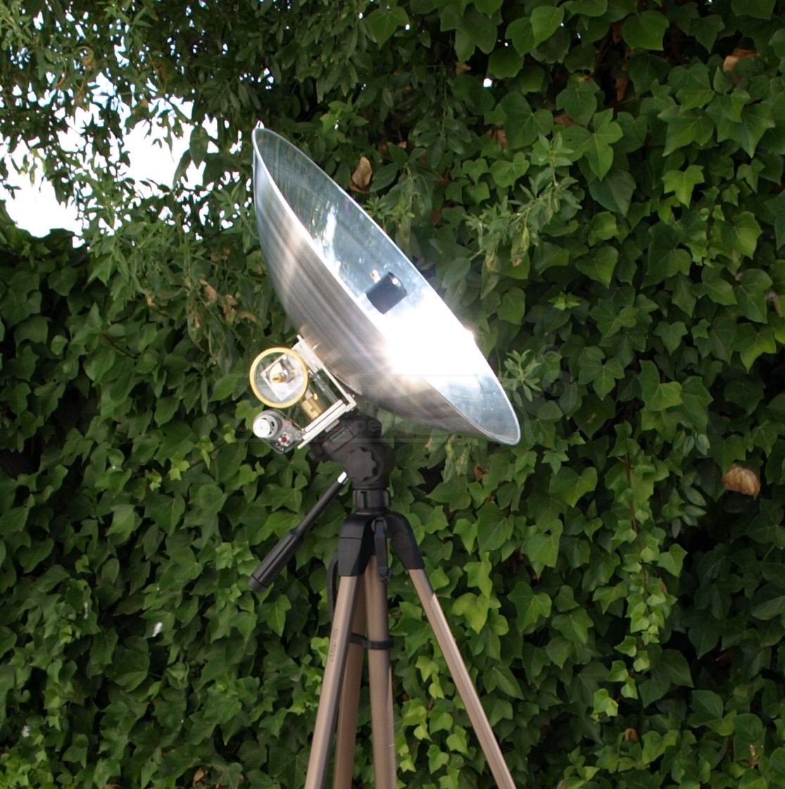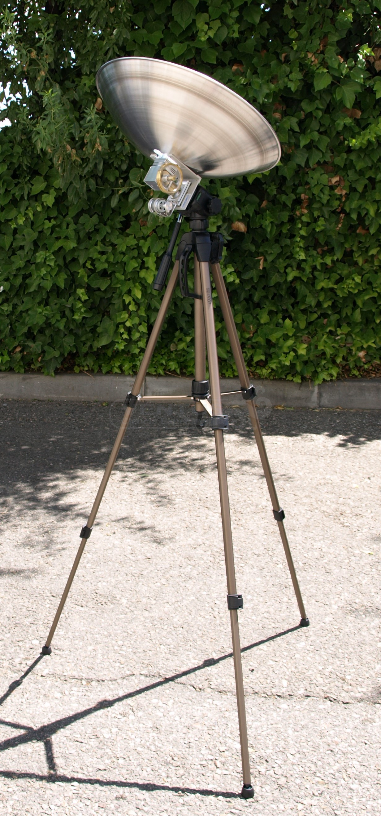 El pistón del motor Stirling está situado en el foco del reflector parabólico de tal forma que alineándolo con los rayos solares se consigue una alta temperatura que permite el giro del volante del motor a alta velocidad.