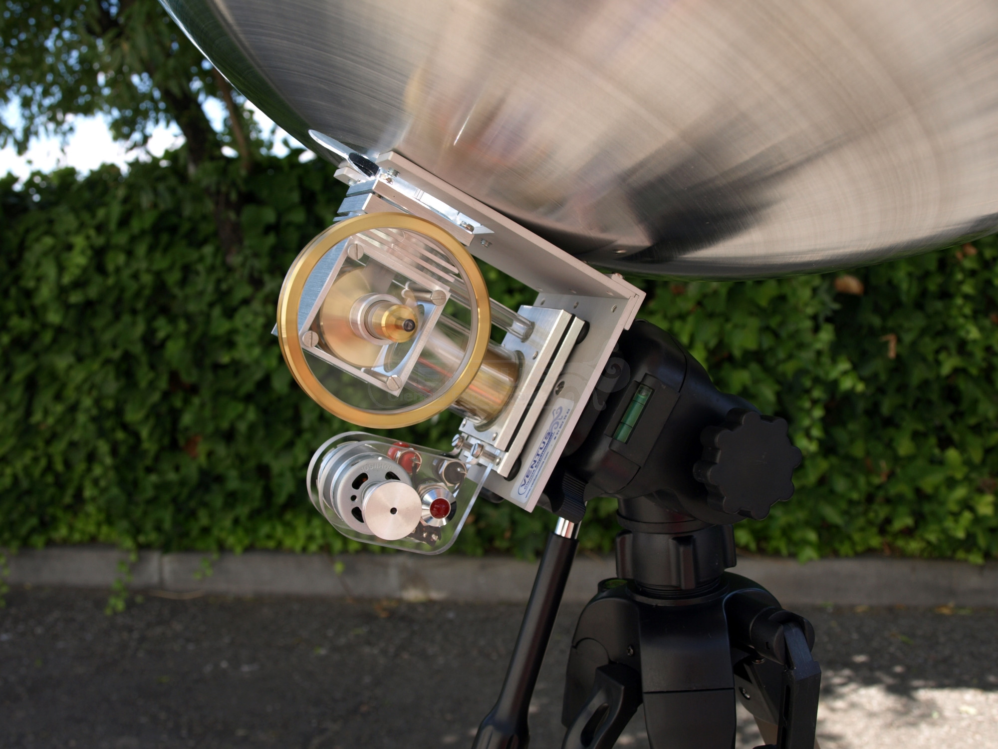 Diámetro del reflector parabólico 470 mm capaz de generar 200W de energía térmica. Configuración de pistón a 90º con un funcionamiento equilibrado y silencioso hasta 1000 rpm. Para facilitar la comprensión de su funcionamiento el motor está fabricado en un vidrio especial que permite ver el funcionamiento de cada una de sus partes. El cigüeñal está montado sobre rodamiento de bolas de acero templado.